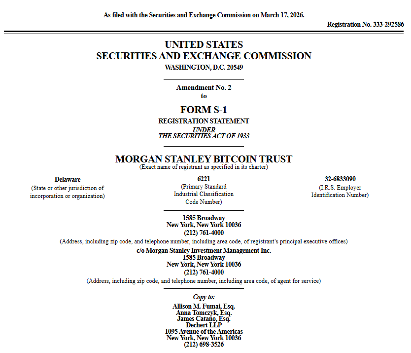 In a recent filing with the U.S. Securities and Exchange Commission (SEC), Morgan Stanley said its proposed Bitcoin ETF will trade under the ticker ‘MSBT’ if approved. The filing amends the bank’s earlier application submitted in January.